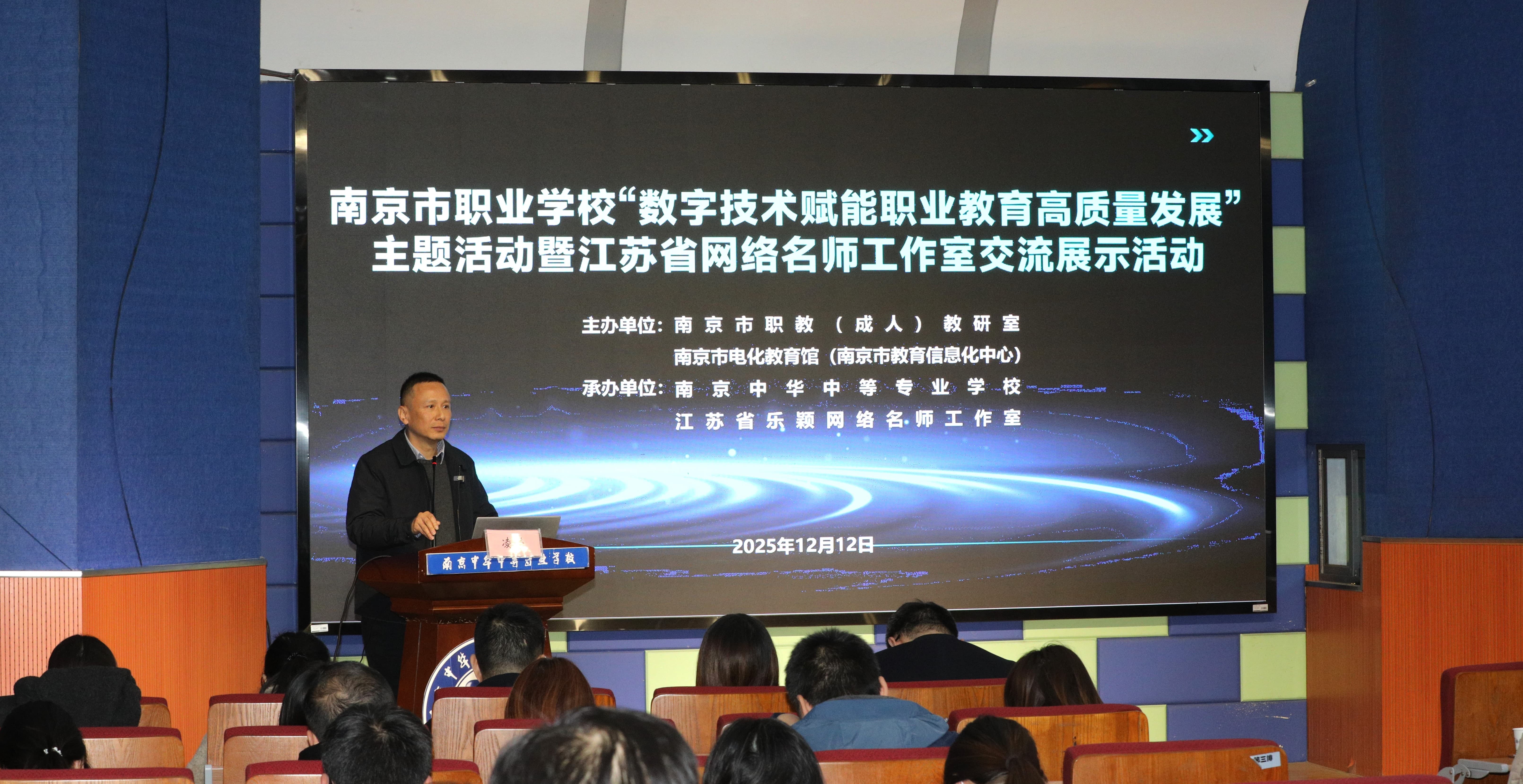 岁末暖冬,暖意融融。为深入贯彻《教育强国建设规划纲要(2024—2035年)》精神,推动数字技术与职业教育深度融合,2025年12月12日,“数字技术赋能职业教育高质量发展”市级主题活动暨江苏省网络名师工作室交流展示活动在南京中华中等专业学校举行。活动围绕“人机协同跨学科知识建构课堂创新探索”这一核心主题展开,南京市电化教育馆副馆长凌嵘、南京市职教(成人)教研室相关负责人、各职业院校同仁及线上观众共同参与,一起探索职业教育高质量发展的新路径。