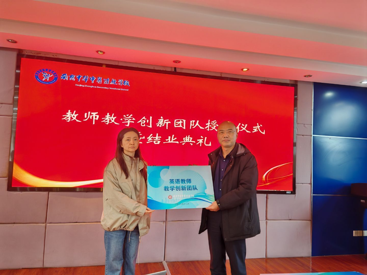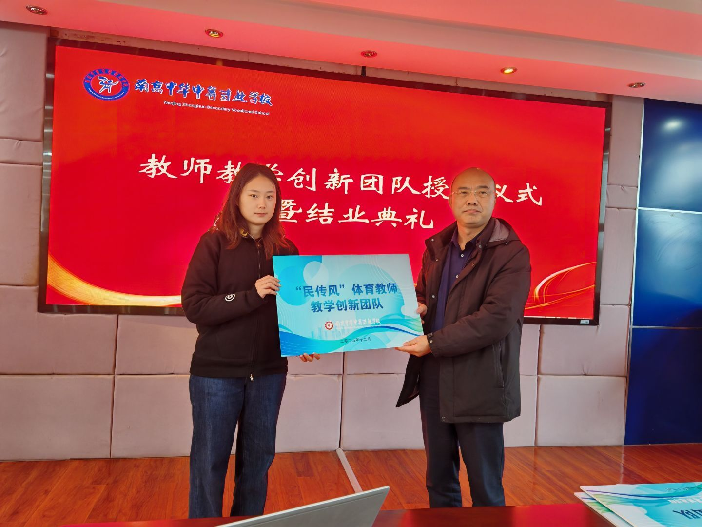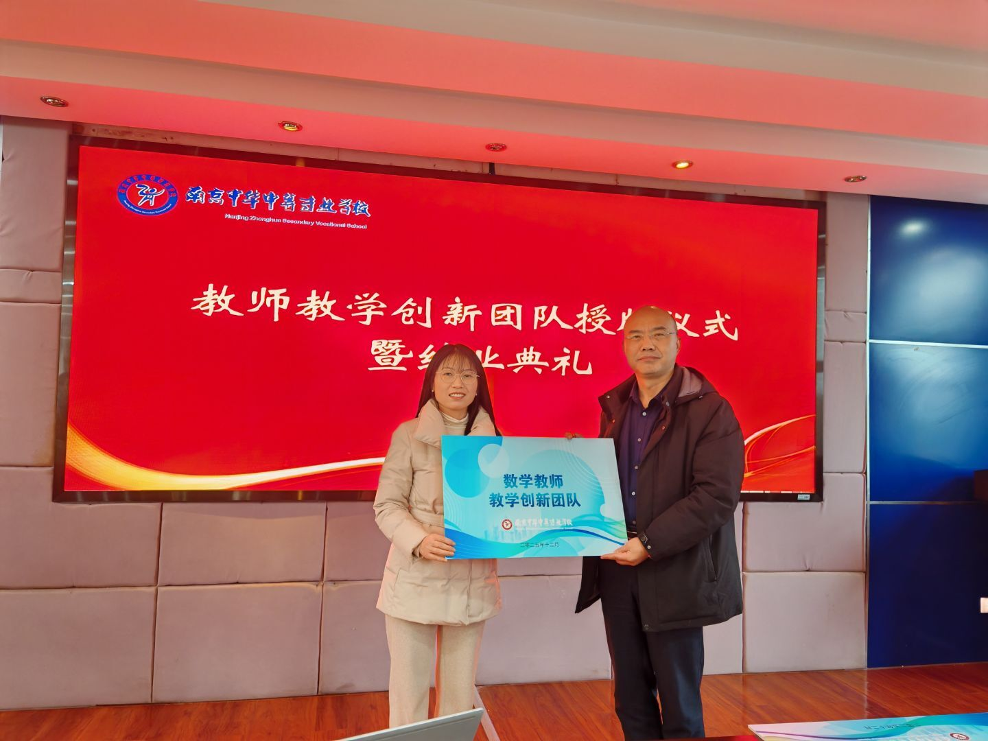 为进一步强化教师队伍建设,提升教师教学创新能力与团队协作水平,打造高素质专业化职教师资队伍,推动学校职业教育内涵式发展,2025 年 12 月 31 日上午,南京中华中等专业学校在三楼会议室隆重举行2025年教师教学创新团队成立仪式。学校党总支张勇书记主持会议并授牌,教师发展处陈莉主任、党政办闫妍主任、培训处徐旸主任、现代服务系朱颖颖副主任,以及数学教研组组长单梅玲、英语教研组组长张蕾、体艺教研组组长徐彤彤等共同参会,见证2025年教师教学创新团队正式启航。