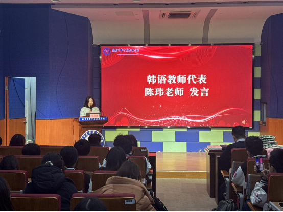 仪式在庄严的国歌声中拉开序幕,悠扬旋律承载着根植于心的家国情怀,为同学们探索多元文化、拓展国际视野筑牢精神根基。随后,国际部韩语老师代表陈玮老师发言,她以真挚的话语分享韩语教学中的育人心得,传递对同学们深耕韩语、逐梦前行的殷切期许,为在场学子注入奋进动力。