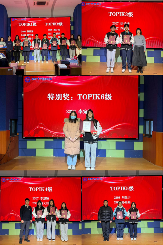 此次奖学金表彰聚焦TOPIK韩语能力考试,等级的每一次提升,都是学子们日复一日勤勉付出的见证。颁奖环节中,学校对外合作与实训管理处唐鹿主任、韩国大学驻中国事务所毕志鹏主任,连同国际部辅导员、班主任们、韩语老师们,共同为通过TOPIK 1级至5级考核的同学们颁发奖学金及荣誉证书。值得一提的是,2307班李宛轩同学通过了韩语等级最高级TOPIK6级考试,作为韩语能力认证的最高级别,此成绩的取得离不开她长期的深耕不辍与精益求精,曹寅副校长为其颁发证书和奖品,全场掌声雷动,一起见证了这一突破性的荣耀时刻。