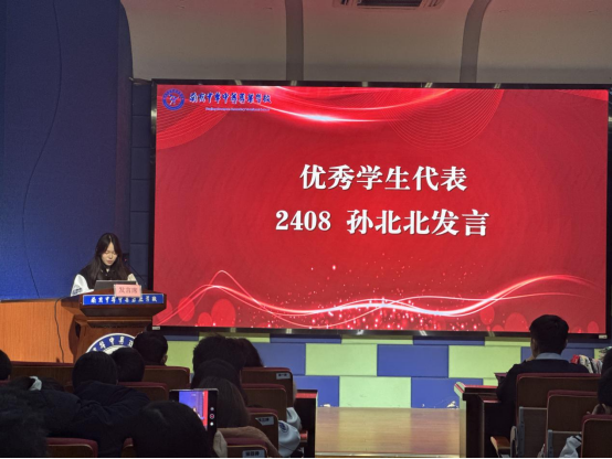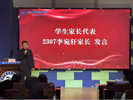 荣耀背后,是学子的笃行不怠,亦是家校共育的温暖支撑。学生代表2408班孙北北同学分享了韩语学习的实用方法与心路历程,为在场的同学们提供了宝贵借鉴;2307班李宛轩的父亲作为家长代表登台,畅谈陪伴孩子日常学习的感悟,字里行间满是尊重与理解,为在场家长带来深刻启发。